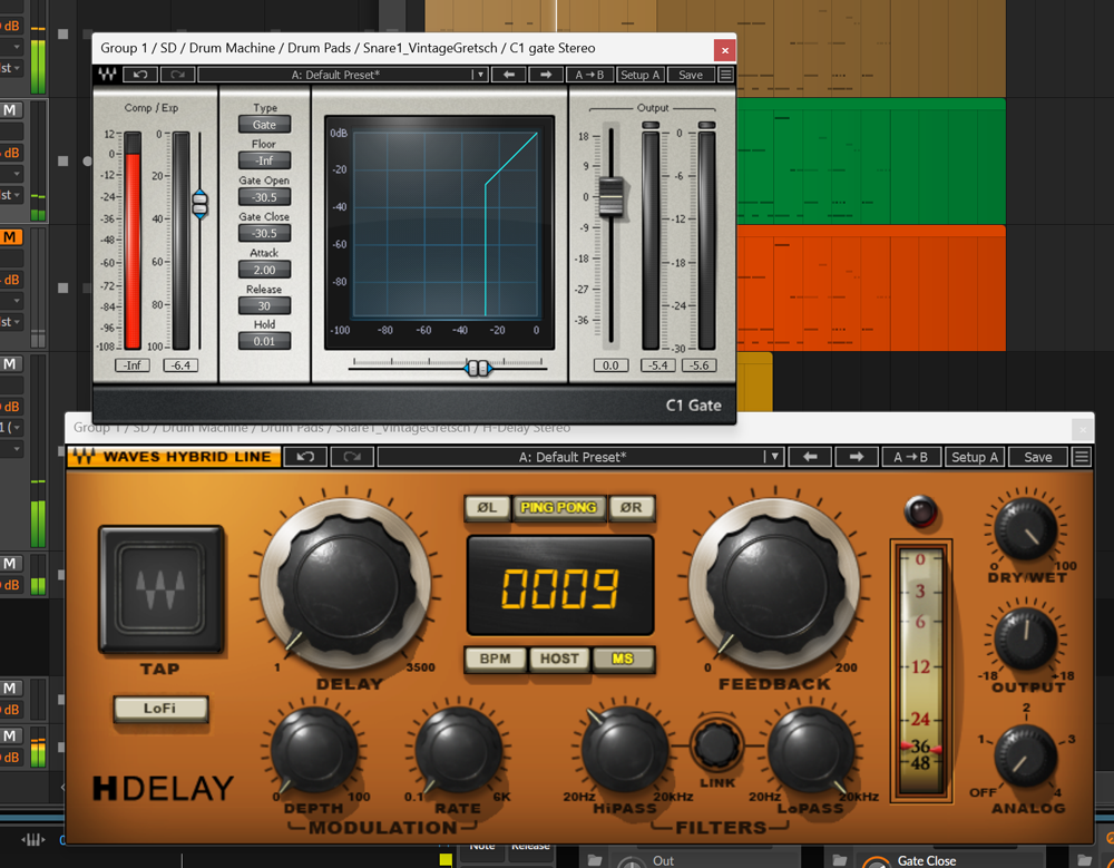 マナー的にディレイチャンネルの方は前段にゲートを挿して頭成分のみをシュワらせるとか